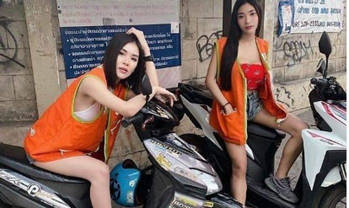 2 orang wanita cantik setia menunggu duduk di atas motor.