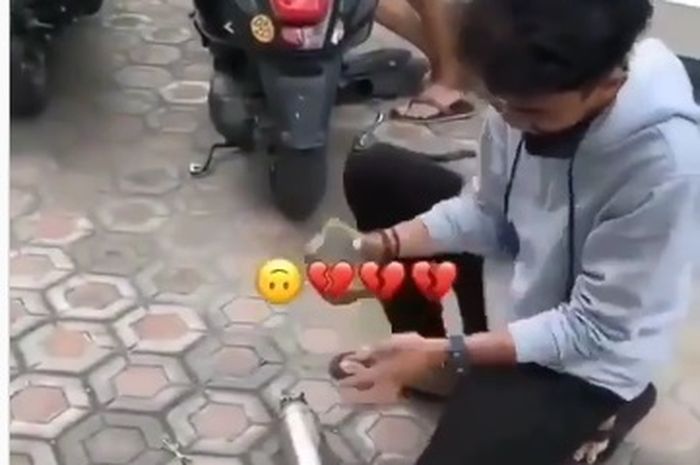 Hatinya ambyar! pengendara Vespa ini harus mau tak mau menghancurkan knalpot brong alias racing miliknya.