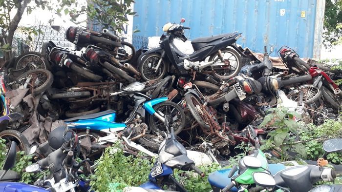 GridMotor.id - Angker! ratusan motor teronggok diselimuti akar pohon, Ninja 150 dan deretan motor matic ringsek tak bertuan.