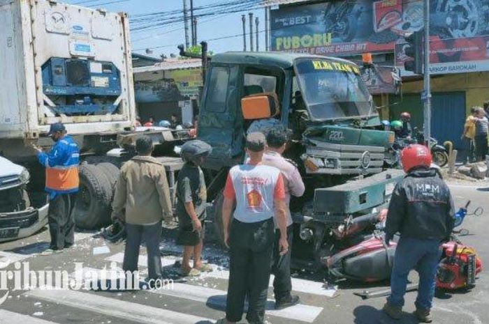 Truk trailer menabrak tujuh motor dan sebuah mobil yang sedang berhenti di traffic light Geluran.