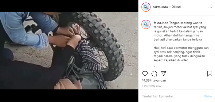 Pada video itu, terlihat tangan seorang cewek terlilit jari-jari pelek motor.