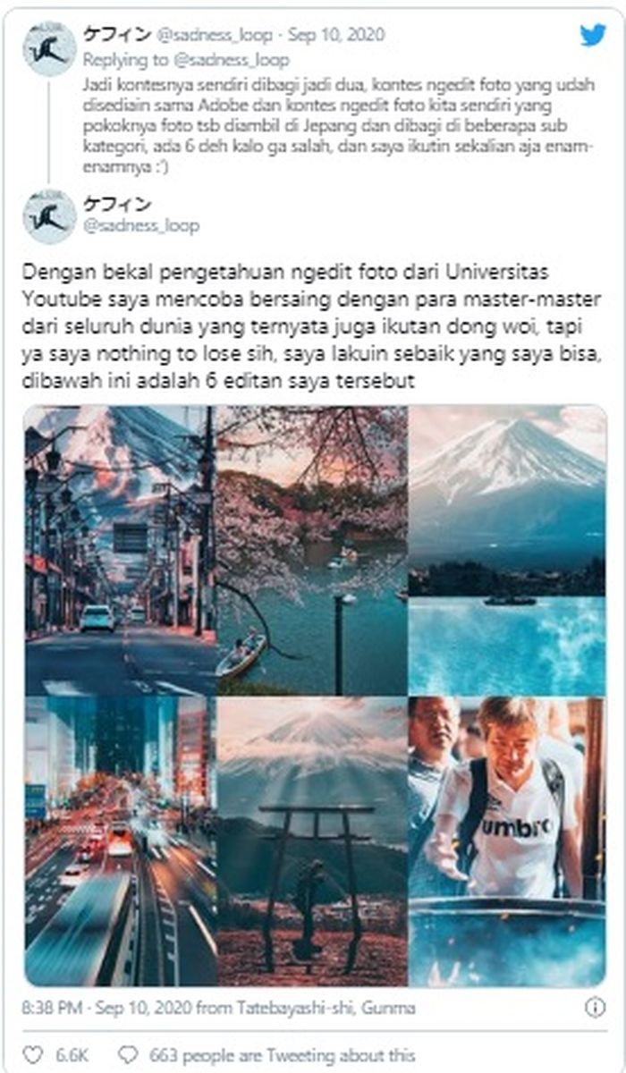 Kisah ini kemudian dia bagikan di Twitter. Mulanya, Kevin mengikuti kontes foto Lightroom yang diadakan oleh Adobe dan Japan National Tourism Organization (JNTO).