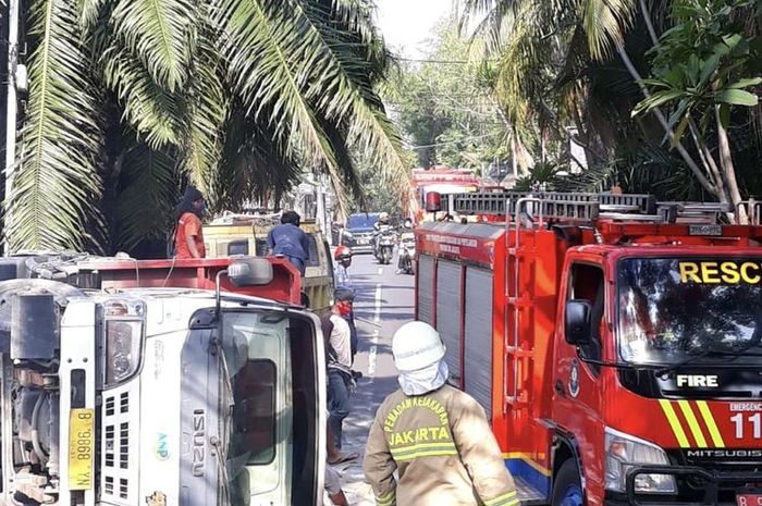 Truk bermuatan semen bernomor polisi B 9868 YN terbalik di Jalan Gunung Balong, Lebak Bulus, Cilandak Barat, Jakarta Selatan.