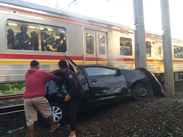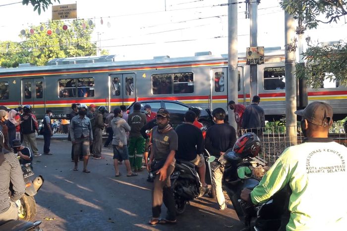 Gridmotor.id - Pemotor hanya menjadi saksi kecelakaan antara mobil dan kereta Listrik (KRL) di perlintasan kereta api Tanah Kusir membuat mobil ringsek.