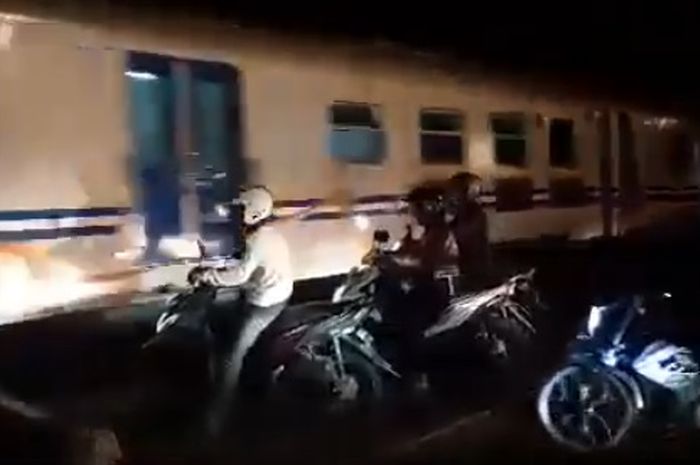 Dalam video tersebut tampak beberapa pemotor nekat menyeberangi perlintasan kereta api.