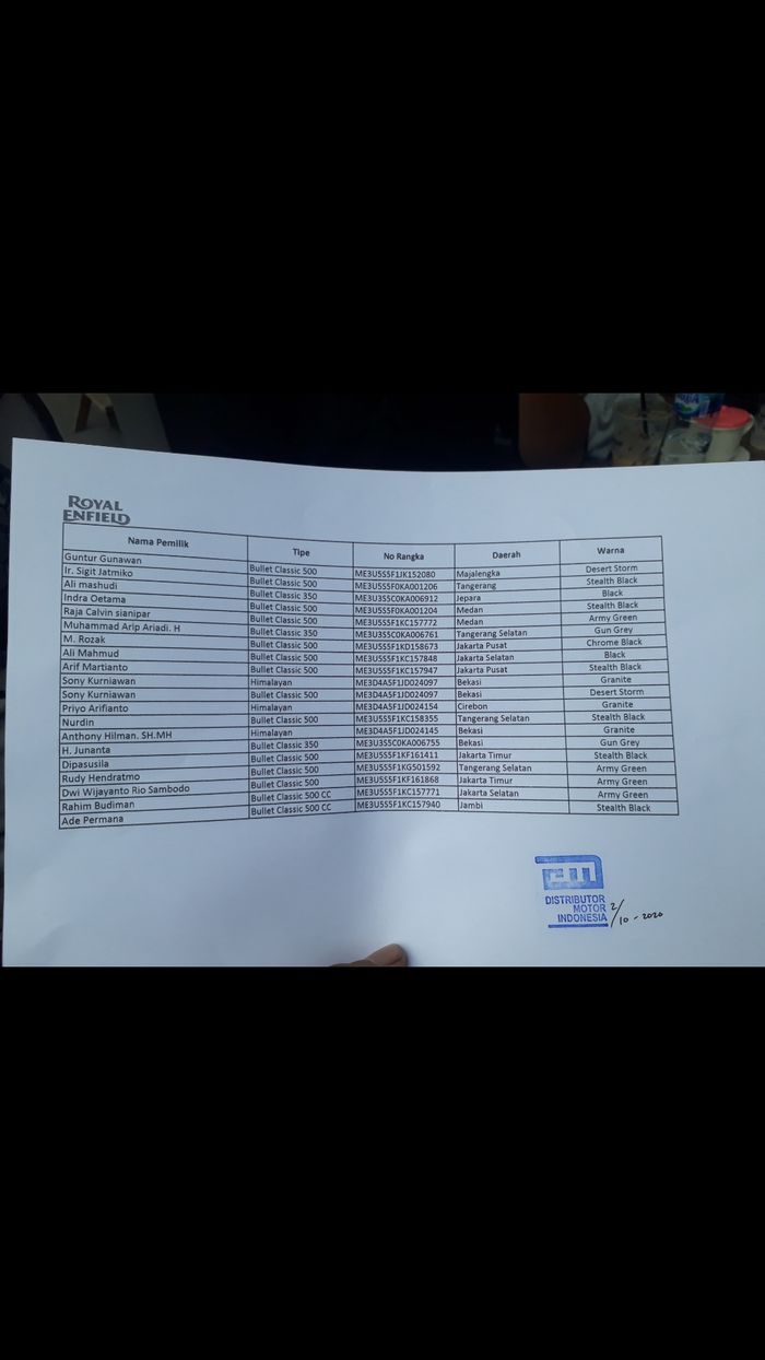"Penyelesaiannya saat ini kami mengeluarkan daftar 20 nama pemilik Royal Enfield yang akan menerima surat kepemilikan motornya," katanya.