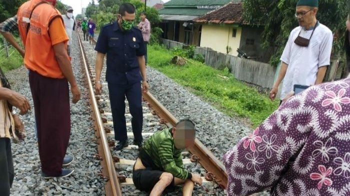 Korban terduduk di tengah rel sambil memegang kepalanya yang berdarah-darah.