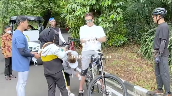 Tak mau menambah bebannya saat bersepeda, Syahrini pun akhirnya memilih untuk menggandeng sepedanya.