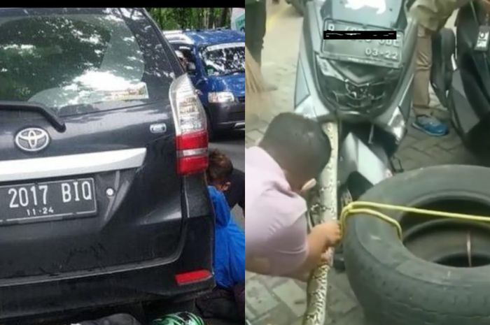 "Saya lihat sudah ramai, ternyata ada ular melilit ban, ularnya melilit di velg, sama warga dan pengendara lain yang melihat kejadian ini berusaha membantu mengeluarkan ular," ujarnya.