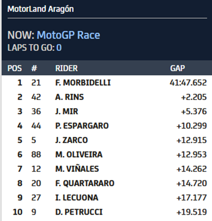 Balapan akhirnya berakhir, dengan Franco Morbidelli meraih kemenangan keduanya di MotoGP 2020.