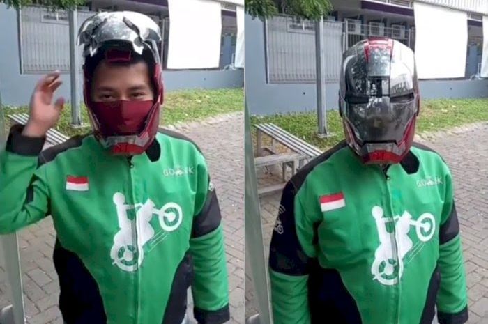 Canggih nih, seorang driver ojol pakai helm Iron Man.