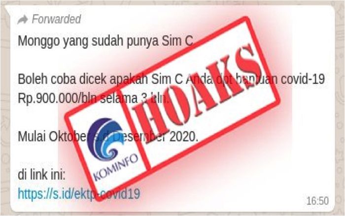 "Beredar pesan melalui Broadcast WhatsApp yang berisi informasi tentang cara mengecek pemilik Surat Izin Mengemudi (SIM) C mendapat bantuan Covid-19," tulis Kominfo.