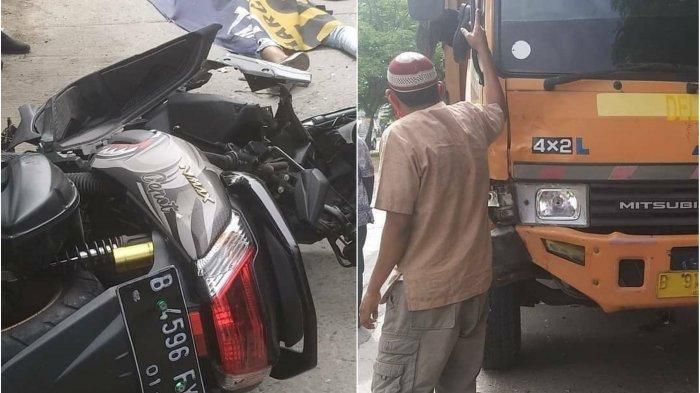 Kecelakaan antara sepeda motor Vs truk terjadi di Jalan Inspeksi Kalimalang, depan Kampus Universitas Pelita Bangsa, Desa Cibatu, Kecamatan Cikarang Selatan, Kabupaten Bekasi, Sabtu (31/10/2020).