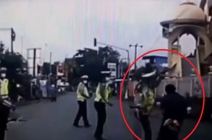 Namun, dengan sigap salah seorang anggota polisi lalu lintas terlihat mengeluarkan jurusnya menendang pelaku hingga jatuh tersungkur.