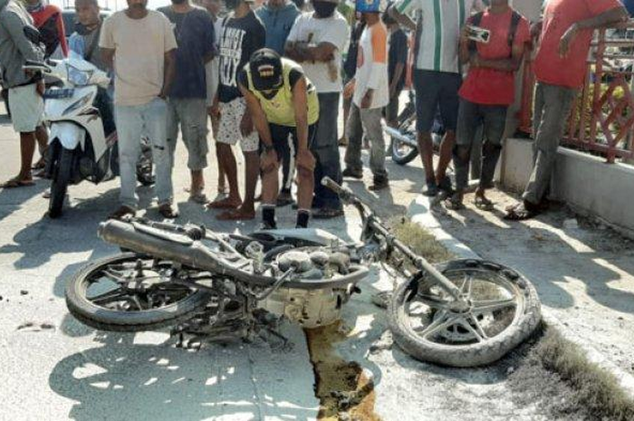 Pemilik motor Yoseph Herbon sesudah kejadian hanya bisa melihat kondisi kendaraan tinggal rangka saja.
