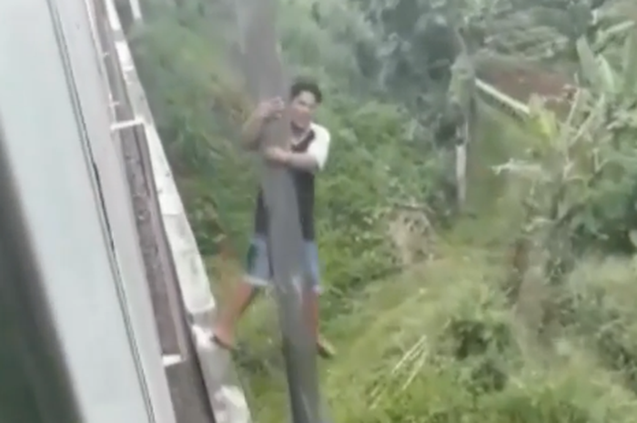 Gridmotor.id - Viral video pemotor yang bergelantungan di tiang jembatan saat berpapasan dengan kereta api, pihak KAI bilang begini.