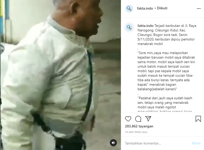"Sore min,,saya mau melaporkan kejadian barusan mobil saya ditabrak sama motor, mobil saya kasih sen kiri untuk belok masuk tempat cucian mobil, tapi pas kepala mobil saya sudah masuk ke tempat cucian tiba-tiba ada bunyi keras, ternyata ada bapak" menabrak bagian belakang(sebelah kanan)," tulis pengemudi mobil dikutip dari keterangan postingan.