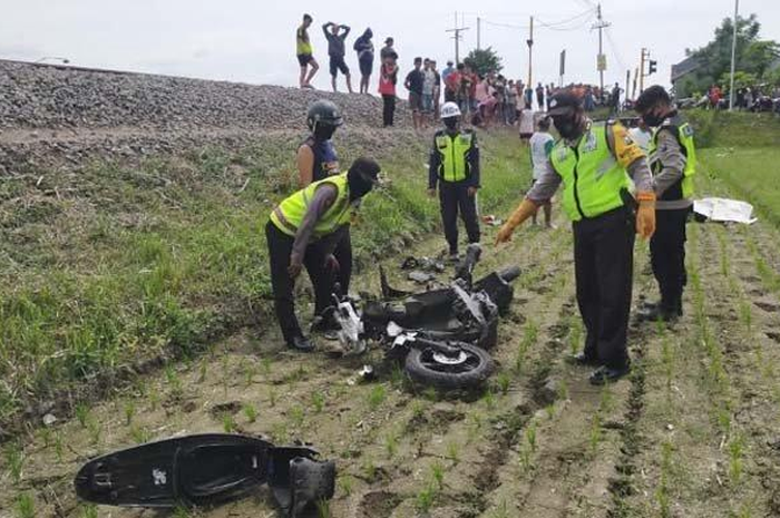 Pemotor tersebut tertabrak oleh kereta api Matarmaja, jurusan Malang-Jakarta.