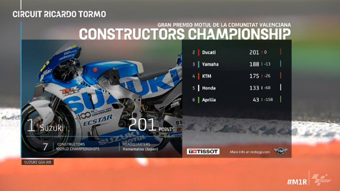 Untuk klasemen konstruktor MotoGP 2020, Suzuki masih punya poin yang sama dengan Ducati, yakni 201 poin.