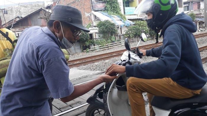 Terlihat pengendara motor memberikan uang langsung ke Gofur untuk jasanya membukakan palang pintu.