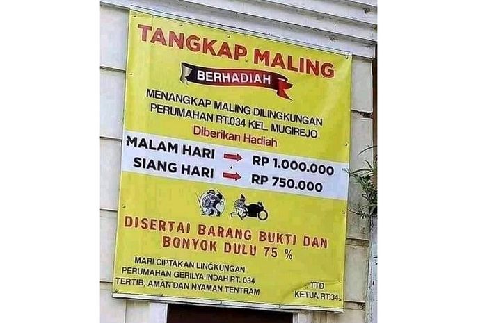 GridMotor.id - Asyik, tangkap maling di daerah ini bisa dapat duit, tangkap malam hari Rp 1 juta, kalau siang Rp 750 ribu.