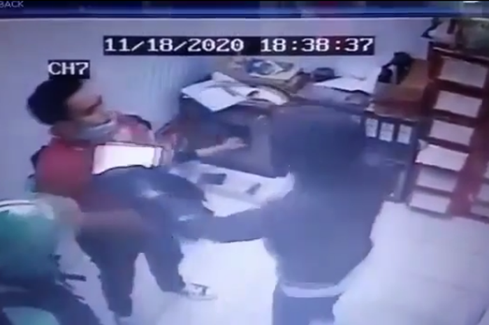 Dalam rekaman itu, terlihat dua orang pelaku yang sedang mengancam pegawai dengan senjata tajam.