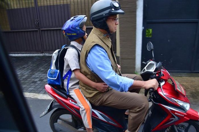 Anies terlihat suka mengantarkan anaknya ke sekolah dengan naik motor matic.