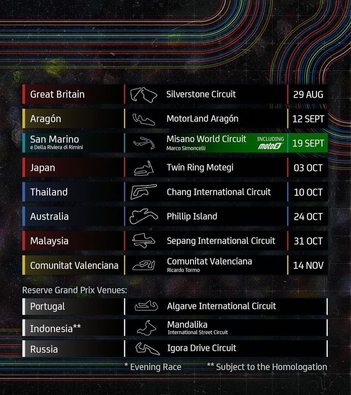 Sampai saat ini, MotoGP Indonesia di sirkuit Mandalika masih masuk cadangan dalam kalender sementara MotoGP 2021.