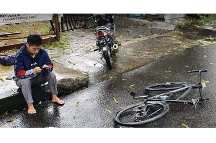 Pada foto, terlihat motor bebek Honda Supra X terparkir, seorang pria duduk sambil main HP dan sebuah sepeda tergeletak di jalan.
