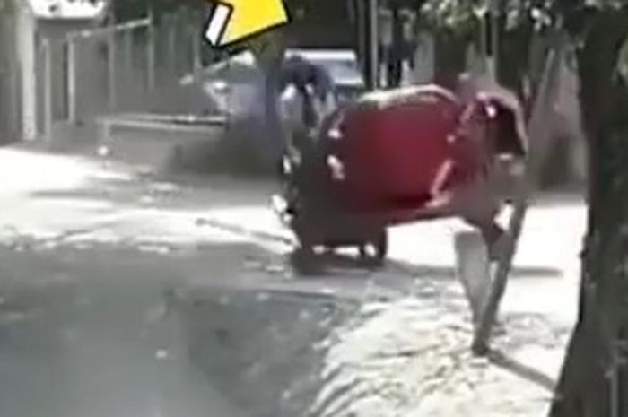 Namun tiba-tiba ada pengendara lain dari arah yang berlawanan menarik mesin molen tersebut.