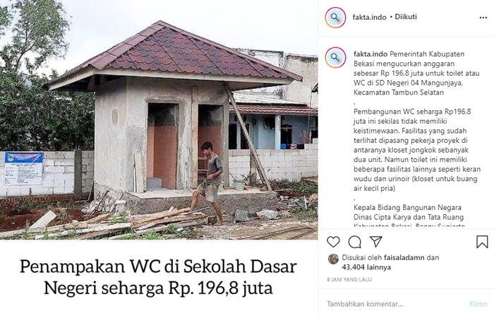 Penampakan WC Rp 196,8 juta itu pun beredar di media sosial, salah satunya akun Instagram @fakta.indo.