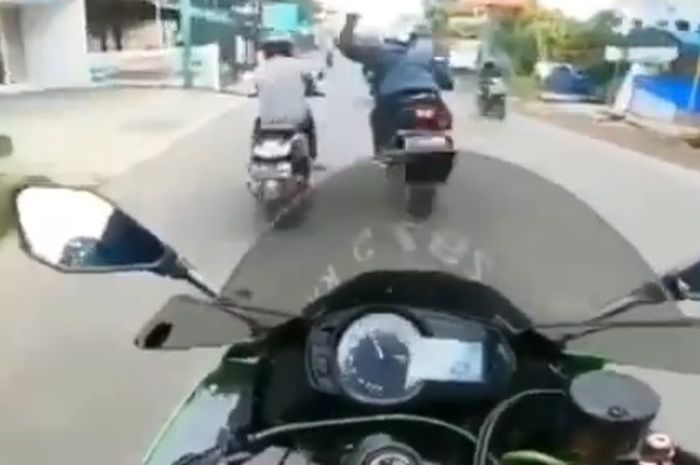 Dalam video terlihat seorang pengendara motor menjitak helm pengendara lain.