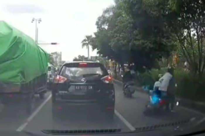 Benar saja salah satu pemotor yang berboncengan tadi terlihat akan menyalip sebuah mobil.