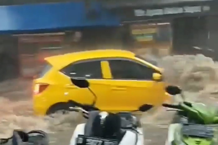 Bahkan ada video yang viral, yang menunjukkan sebuah mobil Honda Brio berwarna kuning yang terseret arus.