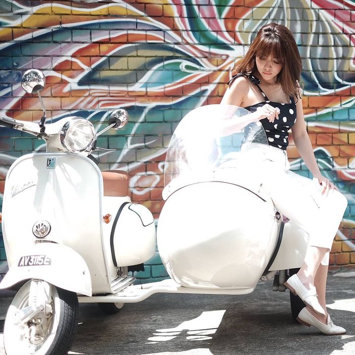Gisel juga terlihat duduk di sespan sebuah motor vespa.
