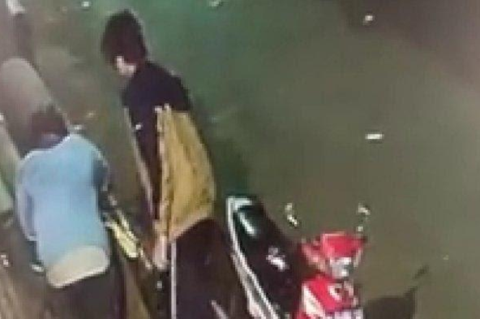 Dan dua orang pria yang terekam CCTV itu mencoba membawanya menggunakan motor bebek.