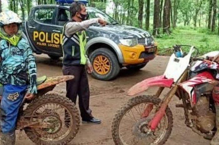 Gridmotor.id - Satgas Covid-19 dari Polsek Loceret Polres Nganjuk bubarkan pemotor trail di bumi perkemahan Plangkat Bajulan.