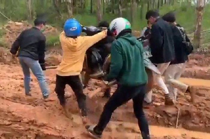 Bahkan saking rusaknya, pemotor terpaksa mengangkat motor agar melintas.
