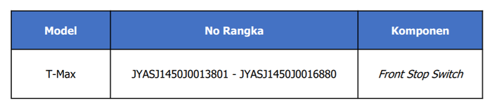 Yamaha Indonesia mengatakan unit motor yang dipanggil adalah Yamaha TMAX dengan nomor rangka JYASJ1450J0013801 - JYASJ1450J0016880.