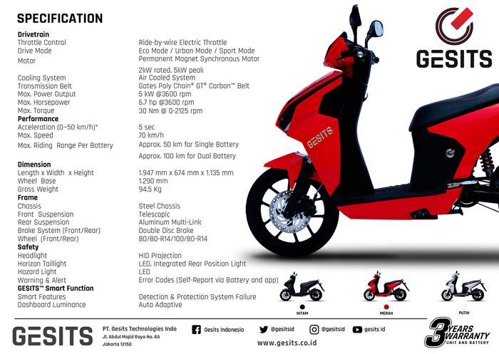 Motor listrik Gesits diklaim punya tenaga maksimal 5 kW di 3.600 rpm, atau setara 6,7 dk.