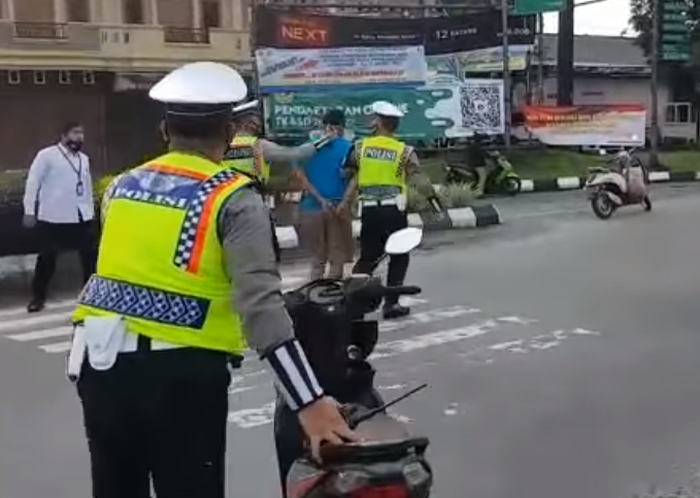 Pelaku yang berhenti di tengah perempatan kemudian mendatangi salah satu anggota polisi dan melakukan penyerangan.