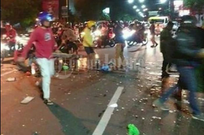 Gridmotor.id - Gelas dan mangkok berserakan di jalan, imbas tabrakan motor dengan gerobak angkringan.