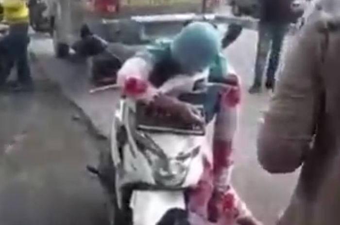 Dalam video terlihat seorang ibu memakai baju gamis berwarna pink bermotif bunga dan kerudung biru muda berada di atas motor.
