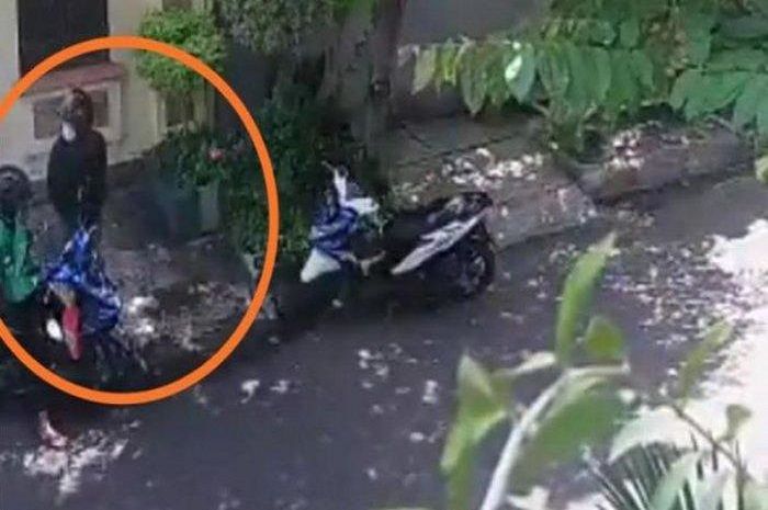 Sementara pelaku lainnya yang mengenakan jaket ojol menunggu di atas motor.