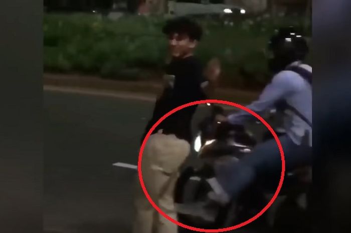 Namun sejurus kemudian, seorang pengendara motor yang datang dari arah belakangnya tiba-tiba menendang kaki pemuda tersebut.