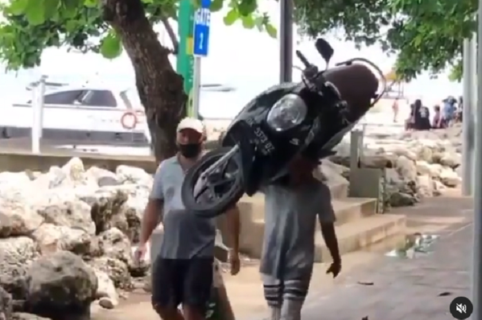 Pada video, terlihat seorang pria mengangkat motor Honda Scoopy.
