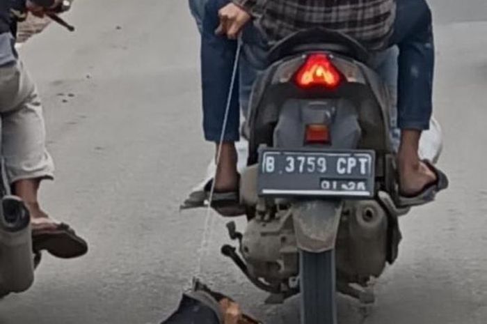 Pria yang dibonceng terlihat sedang menyeret seekor anjing menggunakan tali tuntun.