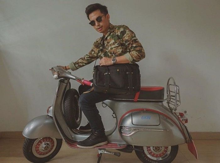 Okin sapaan akrabnya, pernah berpose diatas motor Vespa.