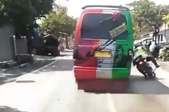 Gridmotor.id - Niatnya baik bukan mau menilang, sopir Isuzu Elf malah senggol polisi sampai terkapar.