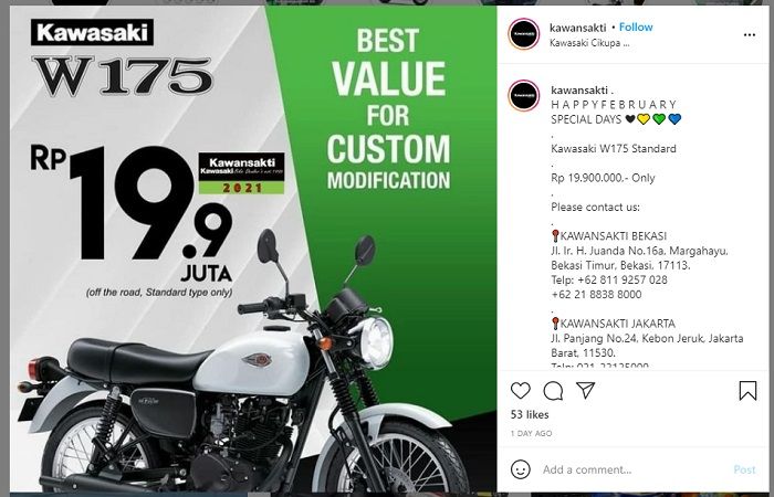 Bahkan bisa dibilang promo pada awal Februari 2021 di dealer Kawansakti untuk Kawasaki W175 standar cukup menggiurkan.